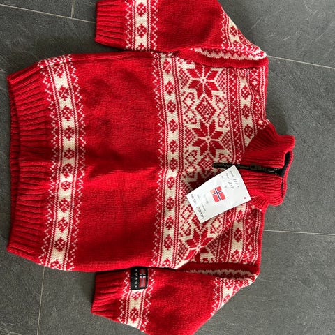 100% ULL. 1-2 år. Flott rød / hvit genser. NORDLYS.