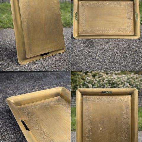 Sort serveringsbrett på sølvbein, brettet kan tas av og brukes som serveringsbrett.