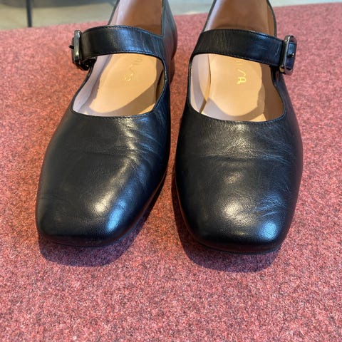 Lave høyhælte sko i skinn-imitasjon fra Simona selges, fordi jeg ikke bruker de lengre. Bredt bånd over foten med rund spenne, som gjør at de sitter pent på foten.