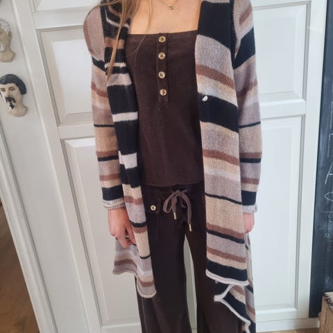 Helt ny ubrukt eksklusiv lang strikket kåpe/cardigan i nydelig GOLD/ BEIGE garn- se etikett for detaljer. Rich& Royal, kjøpt for 2200kr på High Butikk Fredrikstad. GOLD metalizert tro gir en lekker skinnende effekt.Oversized ,passer M.
