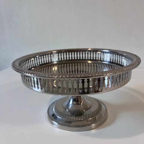 Meget pent eldre kakefat i engelsk stil. Diameter ca 28 cm. Høyde ca 11 cm. Kan sendes med postnord kr 69.
