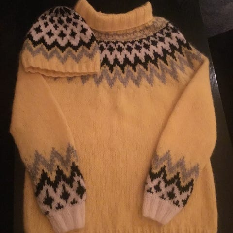 Bilde av type garn og blandingsforhold finnes i bilder. Vaskeanvisningen av garn er også på et av bildene.