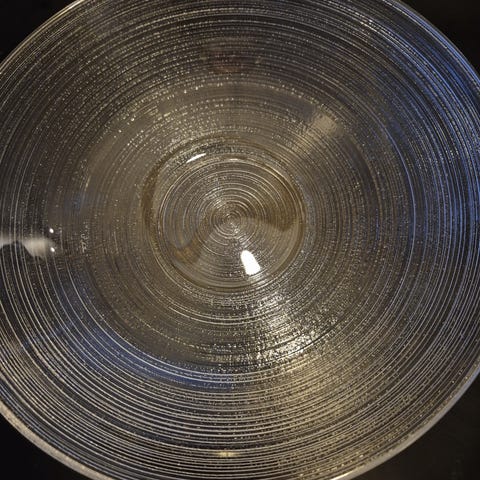 Stort glassfat i klart glass, med svakt mønster av ravgult glass. Perfekt til sommersalaten!