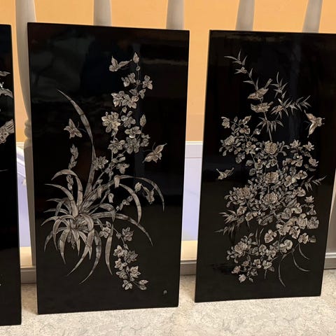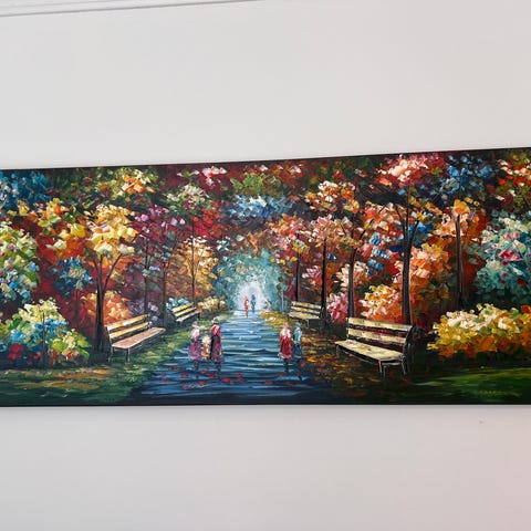 Kjøpt i Thailand. Er laget en egen ramme bak på bilde som holder lerrete. Det bør kanskje strammes, evt lage ny. Flotte farger. Mål: 1m X 1m.
