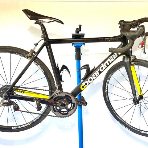Monoc Vipera custombygget med oppgradert utstyr. Hjul, for- og bakgaffel i carbon. Rammetriangel i aluminium. 2003-modell som har stått i en privat sykkelsamling. Designet av belgieren Ted Wood.