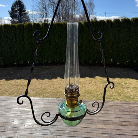 Flott original Alladin lampe i smijern for parafin.originale deler og nesten ikke brukt.Perfekt til hytta.Det er også en medfølgende skjerm med,men den er veldig flott uten skjerm også.Lampen gir et flott lys.Nyprisen er nå flere tusen kroner.