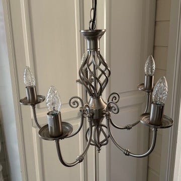 Pen taklampe til f. eks. spisestue selges. Mørk grå velourstoff. Følger med pærer.