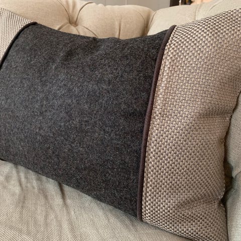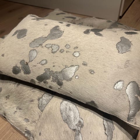Pyntepute 45 x 45cm sydd i brunt skinn med ullstoff bakside (Bardal, Gudbrandsdalens uldvarefabrikk). Putene er sydd i hud fra C. Hemsen. Inkludert innerpute av fiber, glidelås.