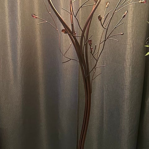 Veldig vakkert og dekorativ bordlampe, laget av messing, formet som et lite tre med blomster av gull/sølvfarget metall. "Metallblomstene" danner en vakker kontrast mellom myke "blomster" og hardt metall, kombinasjonen er virkelig iøynefallende.