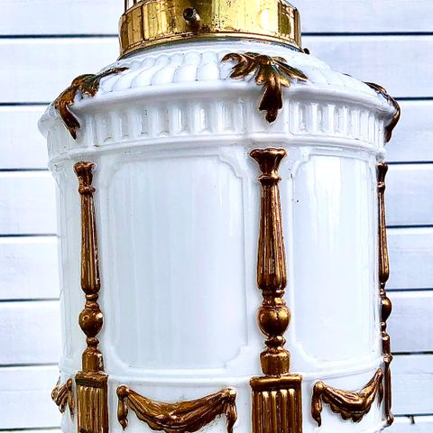 Lampen er merket Delft på baksiden, se foto. Total høyde er ca 12 cm, diameter er ca 7,5 cm. Armaturen mangler en liten del øverst, se foto. Kort ledning uten plugg. Lampen er ellers i god stand, se foto.