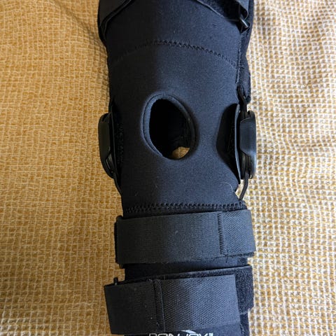 Postoperative knæortose/ kneskinne med 4 punkts prinsipp og ekstensjon/fleksjonsbegrensninger, selges.