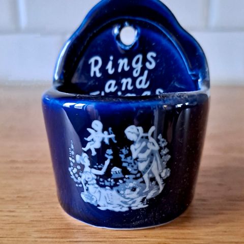 Søt og praktisk oppbevaring til småting. Et lite nagg på innsiden av den til venstre, ellers fin stand.