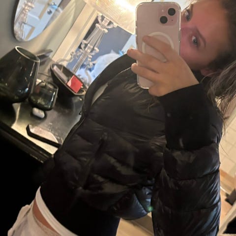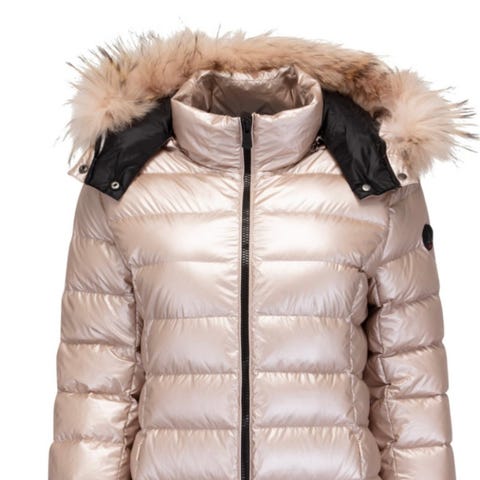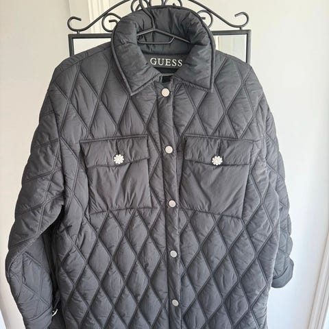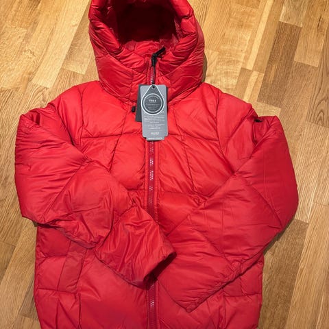 En vattert jakke i vevd kvalitet med trykt mønster. Avtakbar, fôret hette med elastisk snøring, glidelås foran med hakebeskyttelse og lommer foran med glidelås. Lav skuldersøm, lange ermer med innvendig, ribbestrikket kant nederst og skjult, elastisk snøring nederst. Jakkens ytterstoff og fôr er laget av resirkulert polyester.