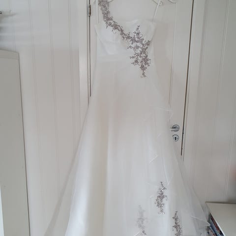 Kjolen er brukt 1 gang. Den er renset og vært oppbevart beskyttet i plast og kjolepose siden. Den fremstår som ny uten flekker eller andre bruksmerker. Jeg har en jakke som er kjøpt til kjolen. Jakken er ikke brukt og inkl. i prisen.