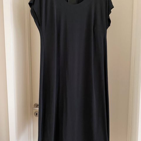 Superfin kjole i klassisk dansk design str 38. Stor i størrelsen og tilsvarer L. Se mål her: Ca 96 cm over brystet, ca 98 cm lang målt flatt. Vil passe ulike størrelser. Nydelig elastisk tykkere bomullsjersey som holder i fasongen. Helt sort og fremstår ubrukt. Eg har for mye klær og alt for mange kjoler. Fin lengde til kneet på meg som er 176 cm høy. Nypris ca 2200,-. Selges billig. Fin med genser under eller singlet og hye støvler. Kan hentes i Skien eller sendes trygt for 70 kroner med Posten/ Postnord. Se også mine andre annonser for eventuell samsending.
