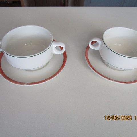3 stk suppeskåler med fat fra Villeroy & Boch. Diameter fat - 17,5 cm. Høyde suppeskåler - 6 cm, diameter - 12,5 cm. Pris: 220kr per sett. Kan sendes, kjøper betaler frakt.