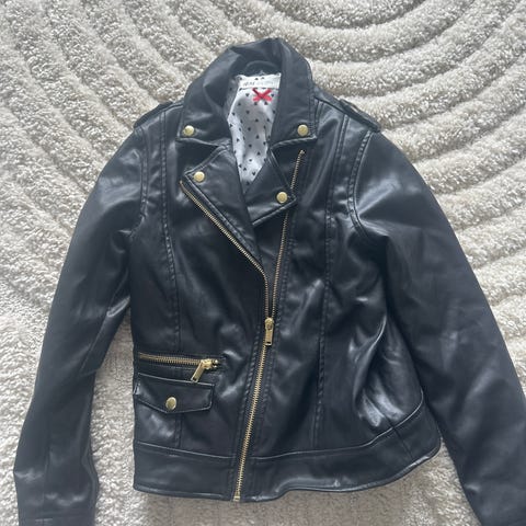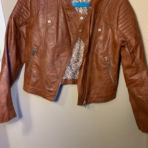 Jakken er i brunt imitert skinn, med fint blomsterfór.