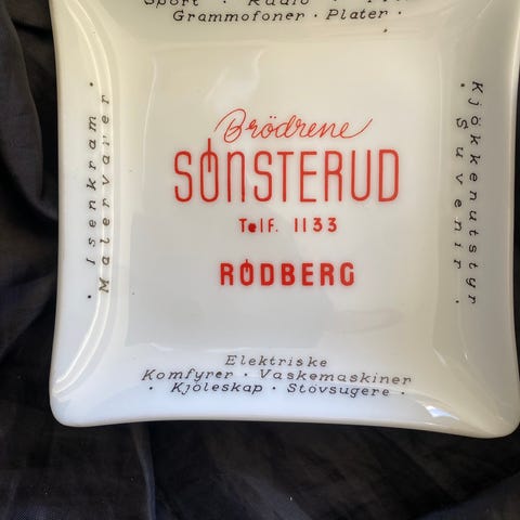 Morsomt reklame askebeger i fra Kelly, litt uvanlig med porselen og ikke glass, noen gå sprekker i gummien, ellers helt og fint