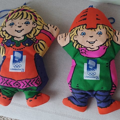 De to maskoter fra OL 1994 (32 år siden) trenger et nytt hjem. Jeg kommer til å savne dem på hytta men nå er hytta solgt.