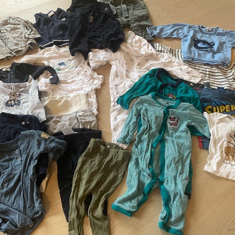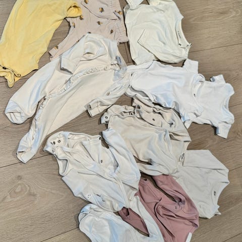 To kortermet body, bukse med ben, mykt sett med bukse og genser, pysjamas og en stabel med langermede bodyer - den øverste er i myk bambusviskose.