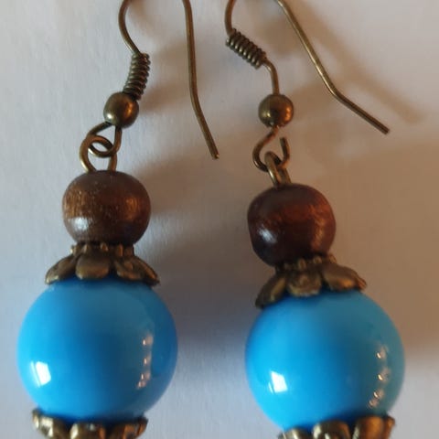 Håndlaget messing øredobber med glassperler. Lengde uten lås 4,5 cm.