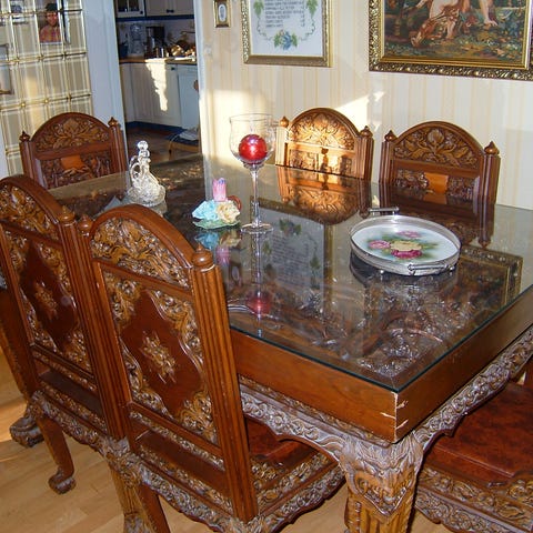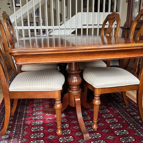 Kan kanskje trenge noe oppussing av bordplaten. Noen stolseter har patinert skinn.