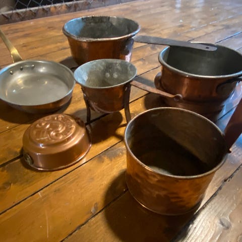 Flotte antikke kjeler med bruksmerker den lille har garantilapp på restaurering