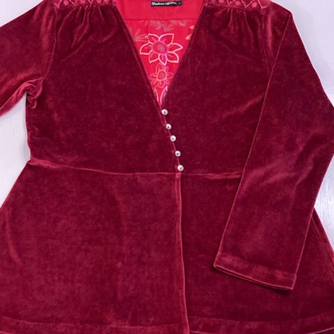 Den er merket str. L, men jeg har ført den opp som str. M i annonsen her. Vil tro den kan passe flere str. Ryggen måler ca. 62 cm fra ribbekant/hals og ned. Ermene måler ca. 52 cm fra armhulen og 57 cm målt fra skulder.