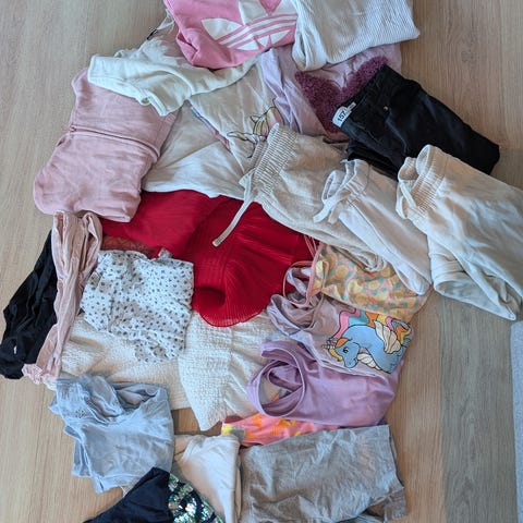 Klespakke jente 8/9 år pent brukt. 2 bukser 4 skjørt 6 overdeler . ….11 plagg. kr200