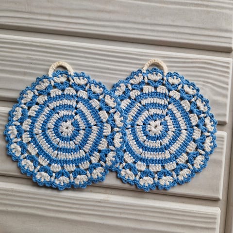 Selger et par heklet grytekluter i 100% bomull. Gryteklutene er doble.