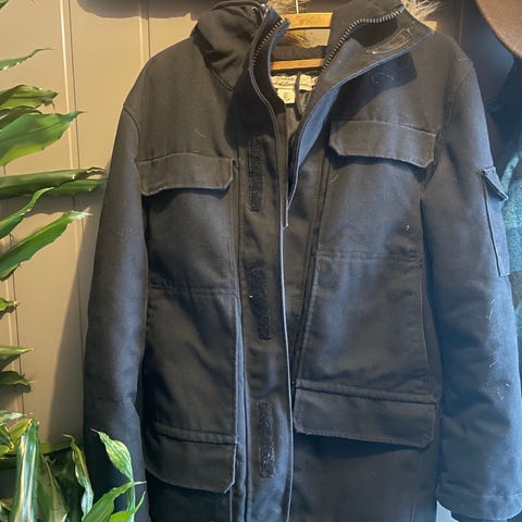 Høst/Vårjakke fra HM, står str.46 i jakken, som tilsvarer str.XS, men den er mer en str. S.