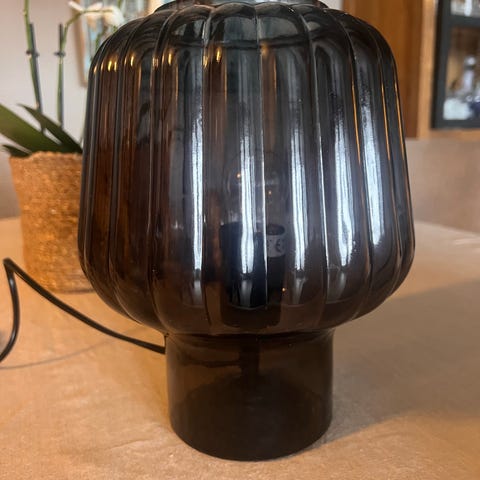 Bordlampe i brunt sotet glass, sort ledning å bryter. H 25 cm. Selges uten pære. Må hentes