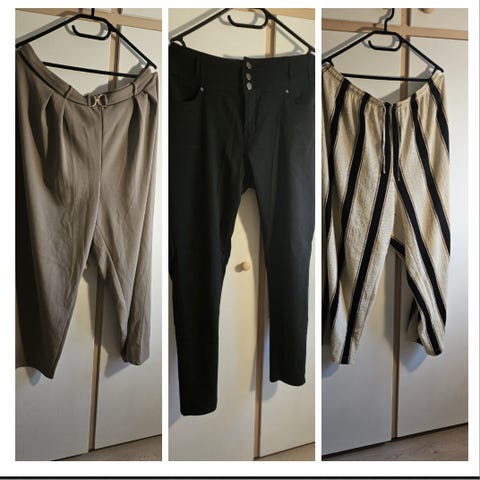1 khaki dressbukse a lá cargo fra na-kd str. 36, med noe vide og lange ben. Og 1 svart dressbukse fra NLY trend str. 36 med straight leg. Selges samlet for 150 kr.
