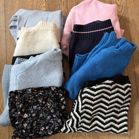 Her vil du få litt av alt: bluser, topper, t-skjorter, tunika, bukser av ulike typer, genser, shorts, sokker og ulltøy, noen størrelser har vinterplagg/yttertøy/tilbehør osv.