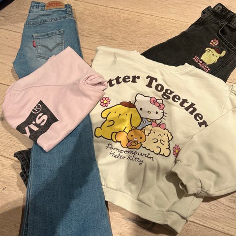 Den hvite genseren er str 140 men kan fint brukes fra str 128, ser ingen hull eller flekker, men kan ha oversett noe.