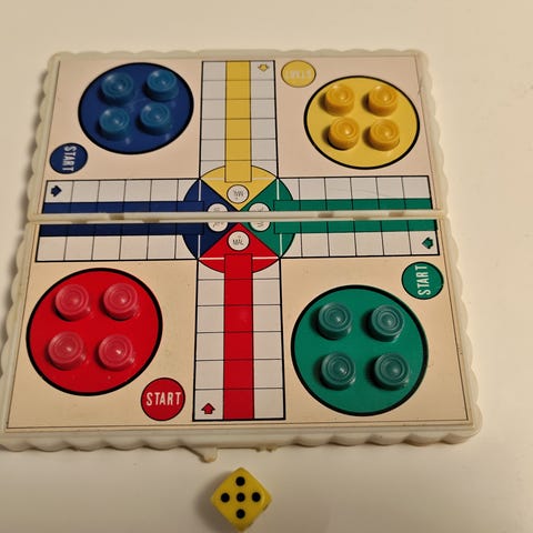 Dette er et gammelt Ludo brett for 4 spillere. Måler 23 cm * 23 cm.