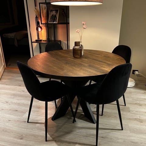 Spisestuen består av bordet SKOVLUNDE 90x160cm (nypris 4.999,-) og 4 stk ONSEVIG fløyel stoler med svingfunksjon (nypris 1.199,- pr stk).
