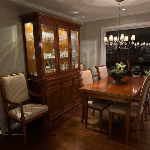 Spisestuen selges helst samlet til annonsert pris, men kan deles opp på førespurnad. Stoler selges ikke enkeltvis.
