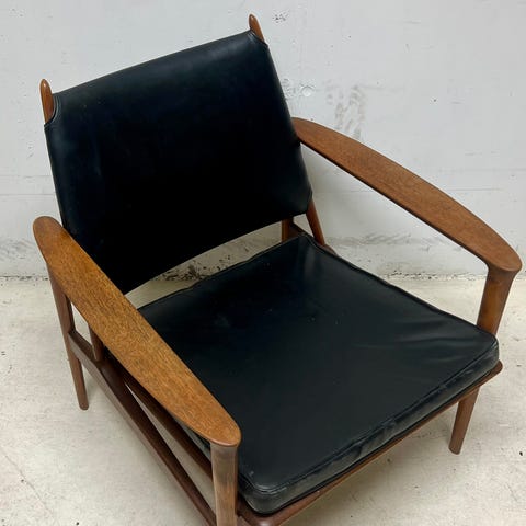 Selger en ikonisk Fox armstol av Rolf Hesland ved Bruksbo Tegnekontor. Stolen er produsert av Haug Snekkeri i 1958/59. Stolen fremstår i original fatning med cognacfarget kjærnelær med flott patina og treverk bestående av eik.