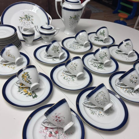Det er tysk porselen. Det har en blå kant med rosa blomster på. Det blir aldri brukt og står bare å tar opp plass, så derfor selges der nå.