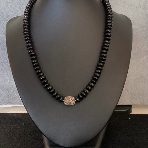 41 cm langt halskjede laget av steinkuler. Kjedet består av 38 kuler som er ca 10mm diam., og en gullforgylt sølvlås, som er ca 13 mm diam. Det er en tradisjonell snepplås, som er lett og trygg å bruke. Stempelet på låsen står det: 925 aha.