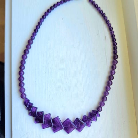 Usedvanlig flott kjede i graverte Amethystperler. L=52 cm.
