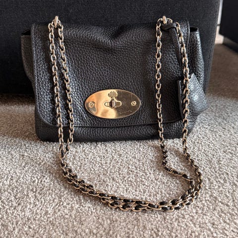 Vesken er sort med gull-lås og lenke.