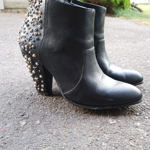 Sorte semskede pumps med gullfargede detaljer. Se bilder. Fargen ser litt gråaktige ut på noen av bildene, men de er sorte. Brukt, men mange skritt igjen i disse 🙂 Amerikansk str. 8M / tilsvarer 38,5. Hælhøyde 9 cm.