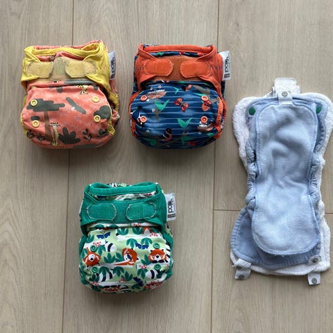 Bleiene: Totsbots Bamboozle stretch. Kjøpt brukt av meg. Opprinnelig str. 2, men har krympet noe i en 90°-vask. (Jeg brukte dem slik fra 8-9 til 14 mnd. alder med storebror, måtte finne andre løsninger allerede ved 5 mnd alder for lillesøster, som har en ganske annerledes kroppsbygning. Har også vært kloret litt hardt én gang, og fikk litt spennende farger av det.) (90°-vask + klor var fordi de hadde stygg lukt i seg da de kom fra forrige eier. Ikke hatt lukt i bleiene etter det.) Litt stiv, men fullt fungerende borrelås. Bleiene har også fått nye strikk i lår og rygg av meg, og i den anledning ble de gjort om til "lommeformsydde", dvs. at ekstra innlegg kan legges inni selve bleia istedenfor løst oppå. På den måten slipper du løse deler når du skal sette på bleia. En klar forbedring fra original design, spør du meg!