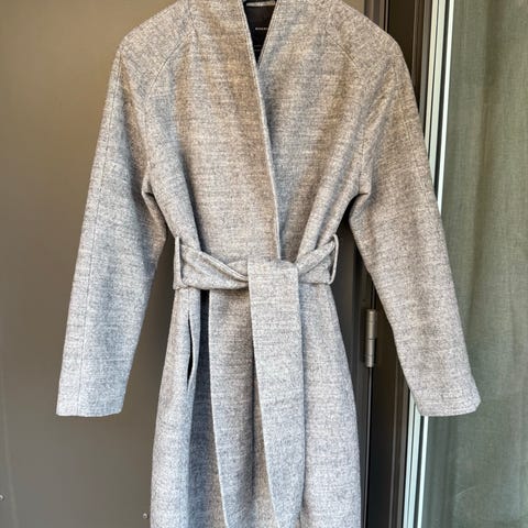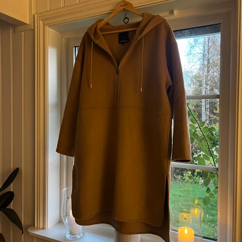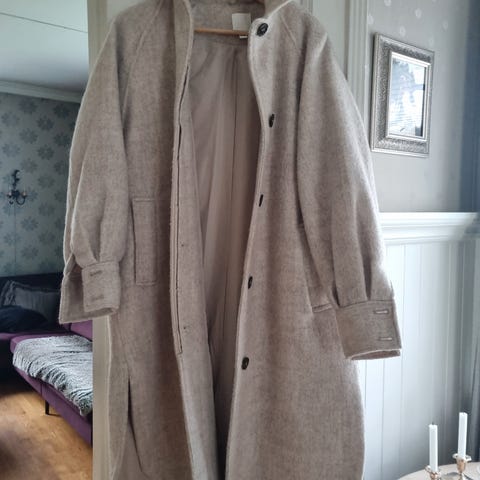 Super høst kåpe i 20% ull/80% polyester, foret, str 38 - merke 'b.young' - to blåfarger med noen okergule striper. Lukning med både glidelås og fine trykknapper. Lengde fra skulder 0,95 cm. Veldig fin! Den er ikke brukt, da str 38 ble altfor stor for meg og dessverre for sent å bytte!