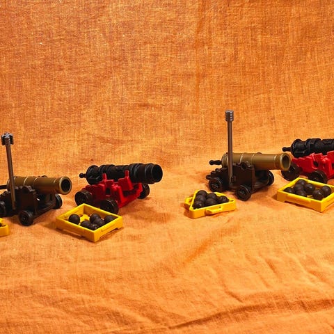 Sjeldne og nostalgiske sett fra Playmobil. Jeg har to eksemplarer av dette, der det ene bare mangler en liten kniv, og det andre mangler div. annet. Jeg har streket over digitalt hva som mangler på de siste to bildene. Original eske/bruksanvisning medfølger ikke. NB: Fire kanonkuler har blitt funnet. Tre kanonkuler har blitt lagt til i eksemplar 1 og en kanonkule har blitt lagt til i eksemplar 2.