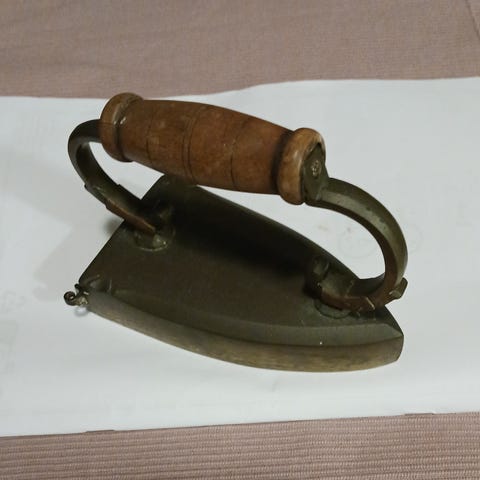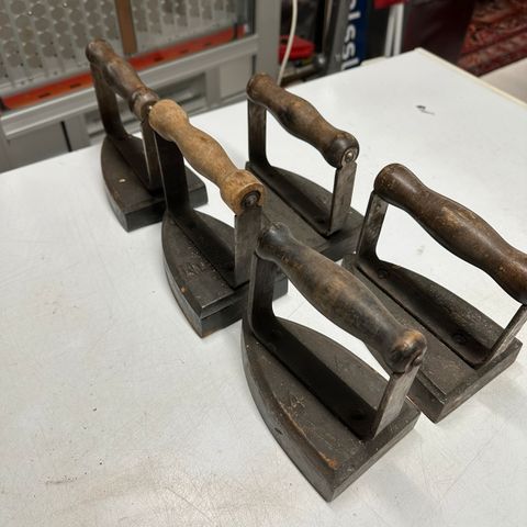 Det kan følge med et antikt strykejernsunderlag / ironstand fra samme tidsperiode. Ironstand har et intrikat og forseggjort mønster.