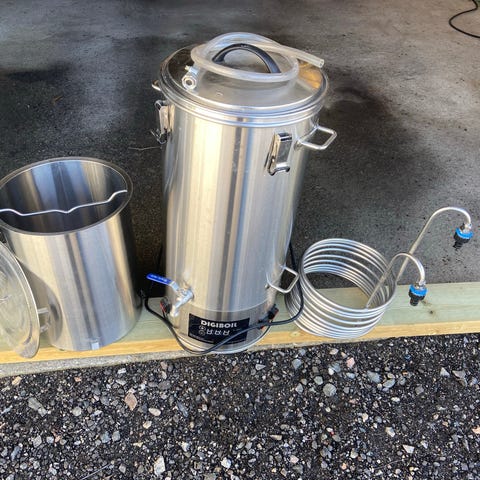 Kjøpte dette for noen år siden, men har brukt det svært lite. Skal være alt du trenger for å brygge selv (med korn). Selges helst samlet. Prisen jeg har satt er halv pris av hva det koster nytt.