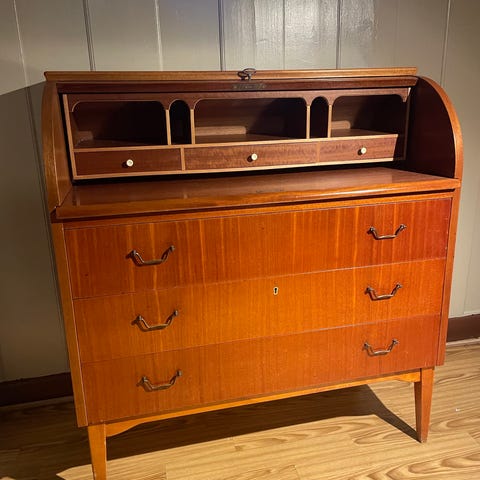 Gammelt oppusset skatoll med speil vurderes solgt. Malt i fargen natural clay. Kom med fornuftige bud.